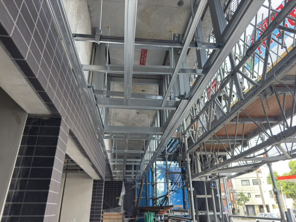 現場ではまず、下地となる軽量鉄骨の精度を確認しました。