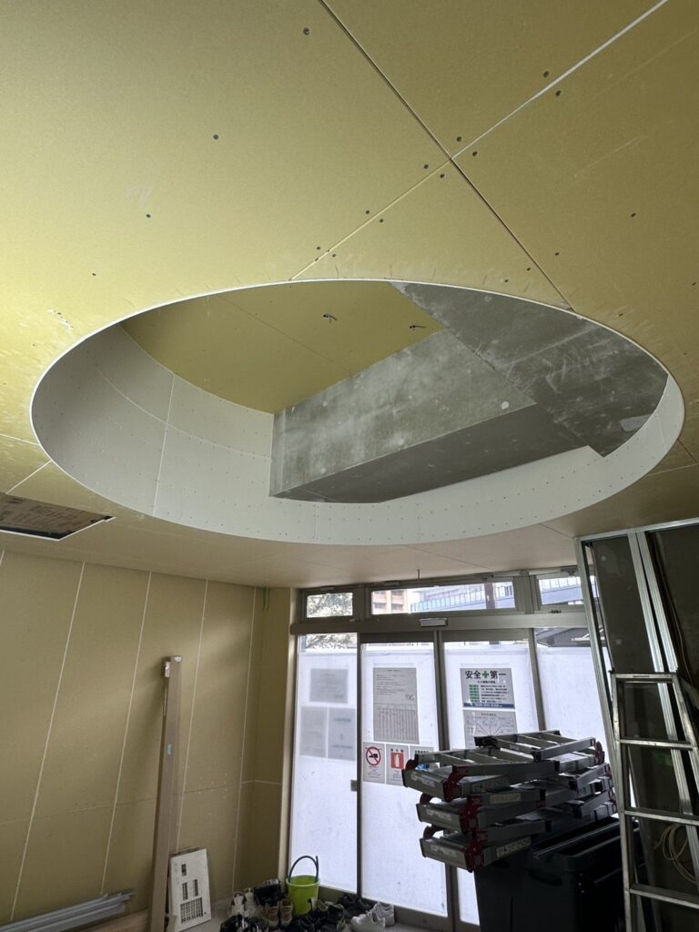 施工画像からも確認できるように、天井の骨組みは野縁受けと野縁を格子状に組み上げ、強固な下地を形成しています。