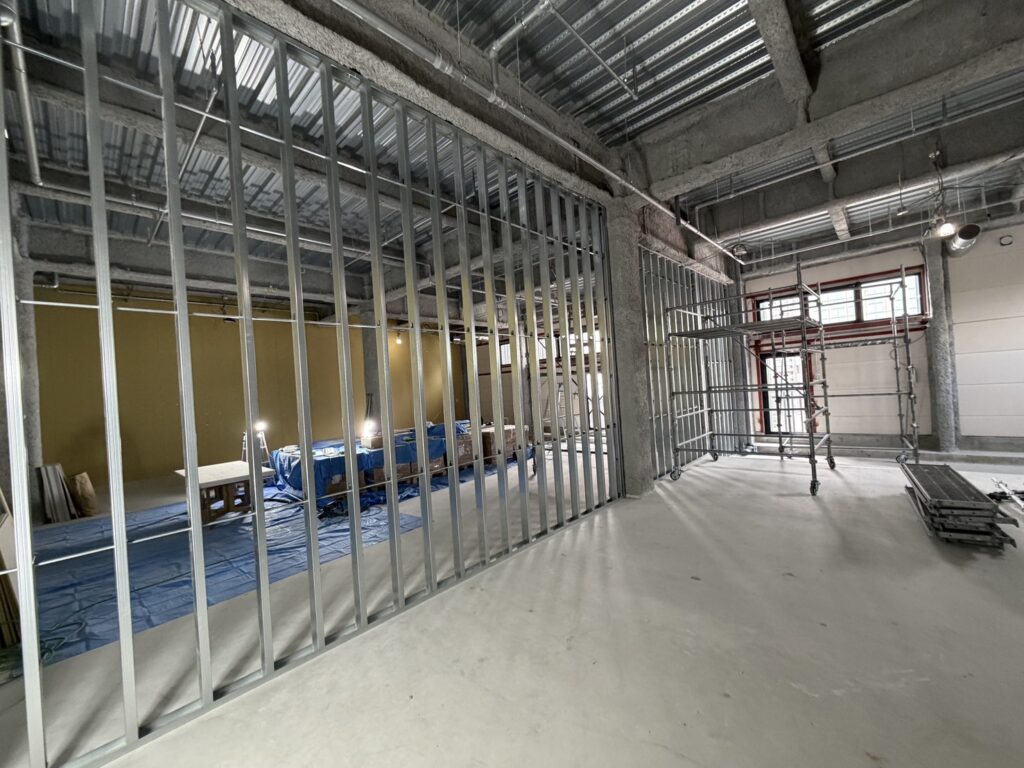 今回の区画整理工事では、軽量鉄骨(LGS)を使用した間仕切り壁の新設を行いました。