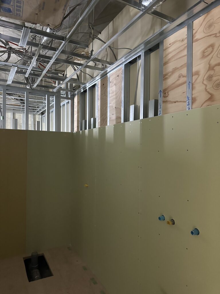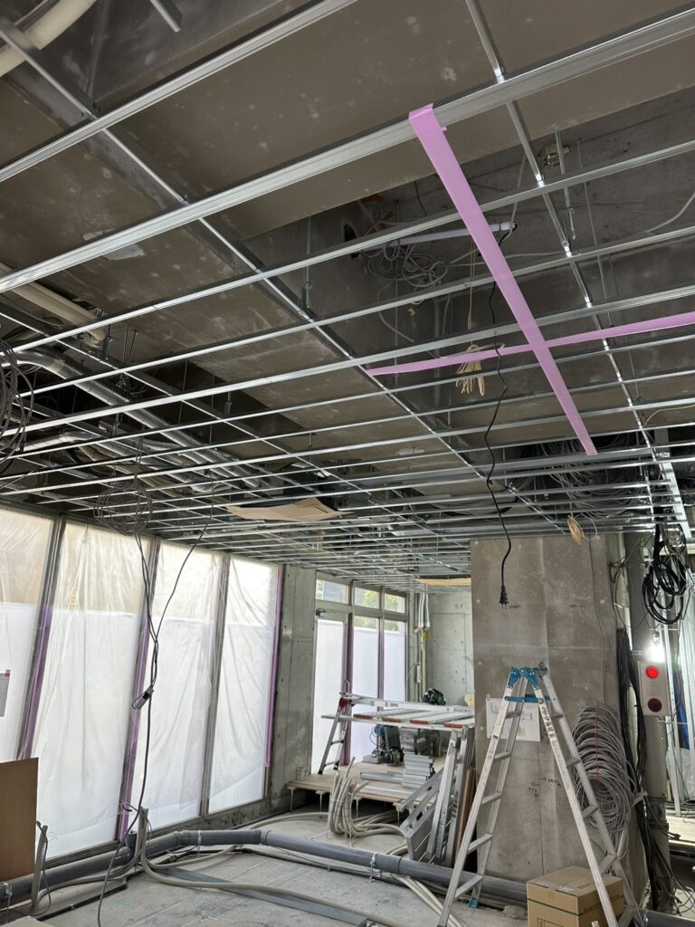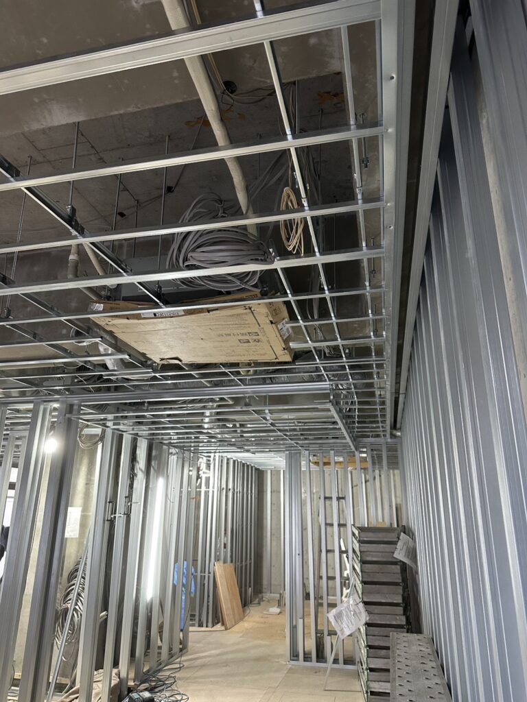 今回の施工では、軽量鉄骨スタッドを使用した間仕切り壁と天井下地を構築しました。